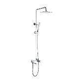 Душевая система с тропическим душем, латунный корпус, комплект, состоящий из ручной лейки со шлангом и держателя для нее, верхнего душа и штанги трубы. Штанга устанавливается параллельно стене с помощью металлических или пластиковых распорников и уже к ней крепятся все остальные элементы. Штанга также используется для подачи воды к верхнему и ручному душу, подключаясь к смесителю через резьбовое соединение, очень важно.