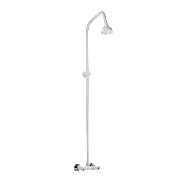 Смеситель белый из высокопрочного АБС пластика в ванную / душевую комнату / кабинку, с жёстким высоким изливом, литой корпус, металлокерамика. Кранбуксы металлокерамика 1/2, ручки крест, поворот на 90˚, чашки и эксцентрики.