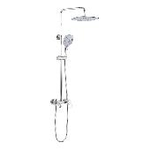 Смеситель + стойка душевая тропический душ с двумя лейками, комбинированного цвета- белый / хром, в ванную, хромированные. В дизайне душевой стойки гармонично соединились строгие линии и мягкие переходы. Она отлично впишется в интерьер ванной комнаты в минималистском стиле. Глянцевое хромированное покрытие не стирается и сохраняет первозданный внешний вид в течение всего периода эксплуатации. Длительную работу без протечек обеспечивает смеситель с керамическим картриджем. Предусмотрен излив для наполнения ванны. Угол наклона верхнего душа можно регулировать в соответствии с потребностями каждого пользователя. Ручная лейка оснащена металлическим шлангом, который не перекручивается во время водных процедур. Смеситель шаровый с коротким изливом, душевым шлангом и лейкой и дивертор переключения в трёх положениях. Картридж d= 35 мм, ручка с кольцом, аэратор для экономии воды, чашки и эксцентрики. Душевая стойка с присоединением к корпусу смесителя и дополнительным креплением к стене и большой квадратной лейкой с эффектом тропического душа.