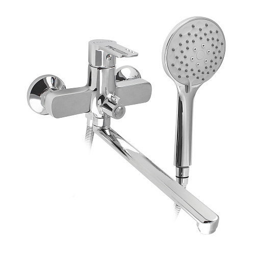 Смеситель хромированный в ванную/душевую комнату с длинным, плоским изливом, тяжёлый, массивный корпус, шаровый с дивертором м/к на корпусе. Картридж d= 35 мм, ручка с прорезью, аэратор для экономии воды, чашки и эксцентрики из нержавеющей стали. Габаритные размеры: ширина 150 мм, высота корпуса 140 мм, длина излива 330 мм, двухрежимная душевая лейка d = 105 мм, шланг 150 см, вес - 1,950 кг, объём - 0,00740 м3.