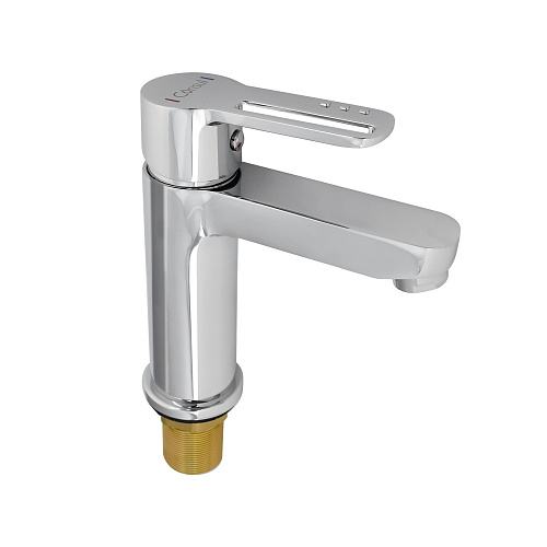 Смеситель для раковины, хромированный, с коротким изливом, литой корпус, ручка с прорезью, шаровый, Крепление резьба - гайка, картридж d= 35 мм. Аэратор для экономии воды. Габаритные размеры: высота 155 мм, длина 155 мм, длина излива 115 мм, диаметр посадочного седла 50 мм, длина резьбы 50 мм, длина подводки 400 мм, вес - 1,000 кг, объём - 0,00295 м3.