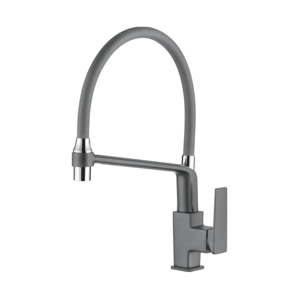 Высокий кухонный смеситель для мойки с гибким изливом. Гибкий излив фиксируется на специальном держателе, обеспечивая функционал стандартного смесителя. В таком положении излив имеет возможность поворота на 360°. Керамический картридж диаметром 35 мм обеспечивает напор воды, комфортный для мыться посуды. Выполнен смеситель из латуни.