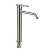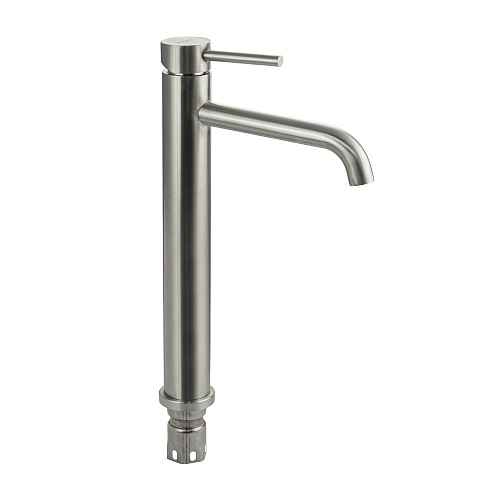 Смеситель для раковины, высокий матовый литой корпус, из нержавеющей стали марки 304, с изогнутым изливом, ручка шток, шаровый. Крепление резьба - гайка, картридж d = 35 мм. Аэратор для экономии воды. Такая модель может использоваться на домашней кухне, на даче, в медицинских учреждениях и общественных местах. Габаритные размеры: высота 350 мм, длина 210 мм, длина излива 170 мм, диаметр посадочного седла 50 мм, длина резьбы 60 мм, длина подводки 450 мм. Вес - 1,330 кг, объём - 0,00445 м3.