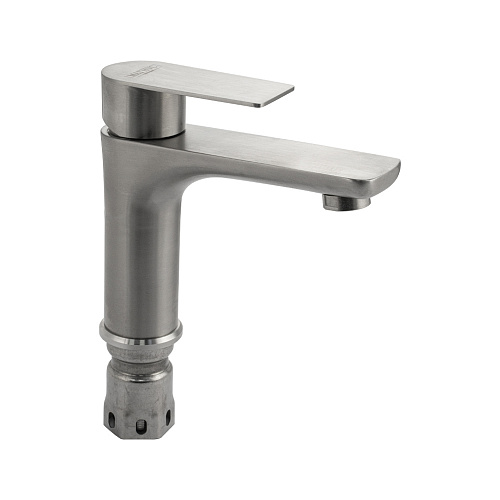 Смеситель для раковины, матовый литой корпус, из нержавеющей стали марки 304, с коротким литым изливом, литая ручка, шаровый. Крепление резьба - гайка, картридж d = 40 мм. Аэратор для экономии воды. Такая модель может использоваться на домашней кухне, на даче, в медицинских учреждениях и общественных местах. Габаритные размеры: высота 155 мм, длина 165 мм, длина излива 120 мм, диаметр посадочного седла 50 мм, длина резьбы 60 мм, длина подводки 450 мм. Вес - 1,350 кг, объём - 0,00200 м3.