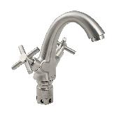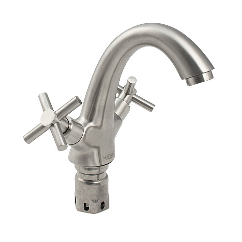 Смеситель для раковин, матовый металлокерамика из нержавеющей стали марка 304, массивный корпус с коротким С-образным изливом, с аэратором для экономии воды. Крепление резьба - гайка. Кранбуксы металлокерамика 1/2, ручки крест, поворот на 90?, Габаритные размеры: высота 150 мм, длина 150 мм, диаметр посадочного седла 50 мм, длина резьбы 60 мм, длина подводки 500 мм, вес - 1,420 кг, объём - 0,00465 м3.