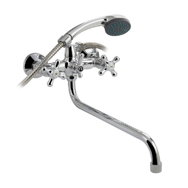 Смеситель хромированный в ванную/душевую комнату с длинным изливом. Материал изготовления — ЦАМ (цинк-алюминий-медь) + нержавеющая сталь. Кранбуксы металлокерамика 1/2, ручки крест поворот на 90˚. Дутый, большой корпус с шаровым переключением подачи воды, аэратор для экономии воды, подставка - "рога" для лейки, чашки нержавеющая сталь, гайки и эксцентрики из нержавейки. Габаритные размеры: ширина 150 мм, высота 240 мм, длина излива 350 мм, диаметр чашки 60 мм, длина шланга 150 см, лейка d = 65 мм. Вес - 1,300 кг, объём - 0,00364 м3.