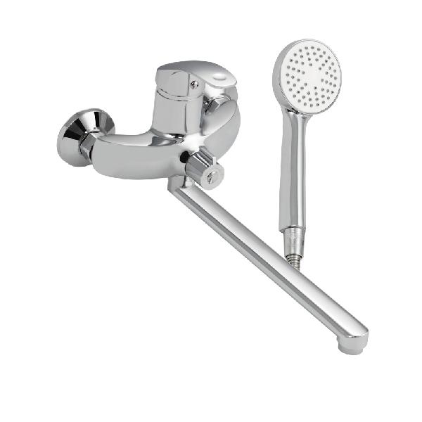 Смеситель хромированный в ванную/душевую комнату с длинным, плоским изливом, изогнутый дутый корпус, шаровый, с дивертором м/к на корпусе. Картридж d= 40 мм, ручка литая, аэратор для экономии воды, чашки и эксцентрики. Габаритные размеры: ширина 150 мм, высота корпуса 155 мм, длина излива 280 мм, трёхрежимная душевая лейка d = 78 мм, шланг 150 см, вес - 1,600 кг, объём - 0,00435 м3.