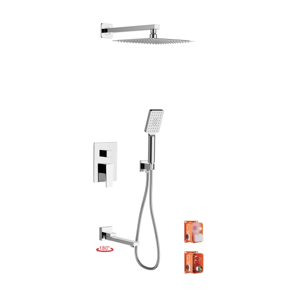 Комплектация: смеситель, скрытая монтажная часть, излив, тропическая лейка, ручная лейка трехрежимная, держатель лейки, шланг 150 см.