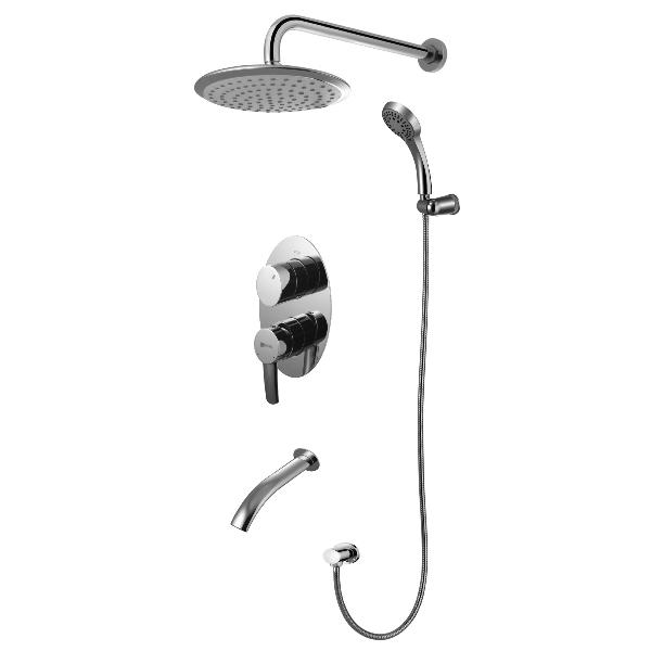 В комплекте поставки: смеситель; излив; ручной душ с держателем; шланг; шланговое подключение; верхний душ с кронштейном.