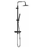 Максимальная безопасность: термостатический картридж 35 мм обеспечивает точную настройку температуры и напора воды. Выставляйте комфортные для вас параметры легким поворотом правой ручки смесителя. Непревзойдённый комфорт и удобство: смеситель выполнен в виде компактной полочки из закаленного стекла, где вы можете хранить все необходимые вещи. Увеличенный диаметр верхнего душа с возможностью регулировки угла наклона и ручная лейка в трендовой форме стика подарят вам полный спектр ощущений - помогут взбодриться утром и расслабится вечером. Переключайте потоки воды между ручной и тропической лейками плавным поворотом левой ручки смесителя, а между ручной лейкой и изливом - поворотом излива. Инновационное PVD-покрытие гарантирует чрезвычайную прочность душевой системы. Матово-черная поверхность не выцветает с годами и устойчива к механическим повреждениям, загрязнениям и отпечаткам пальцев.