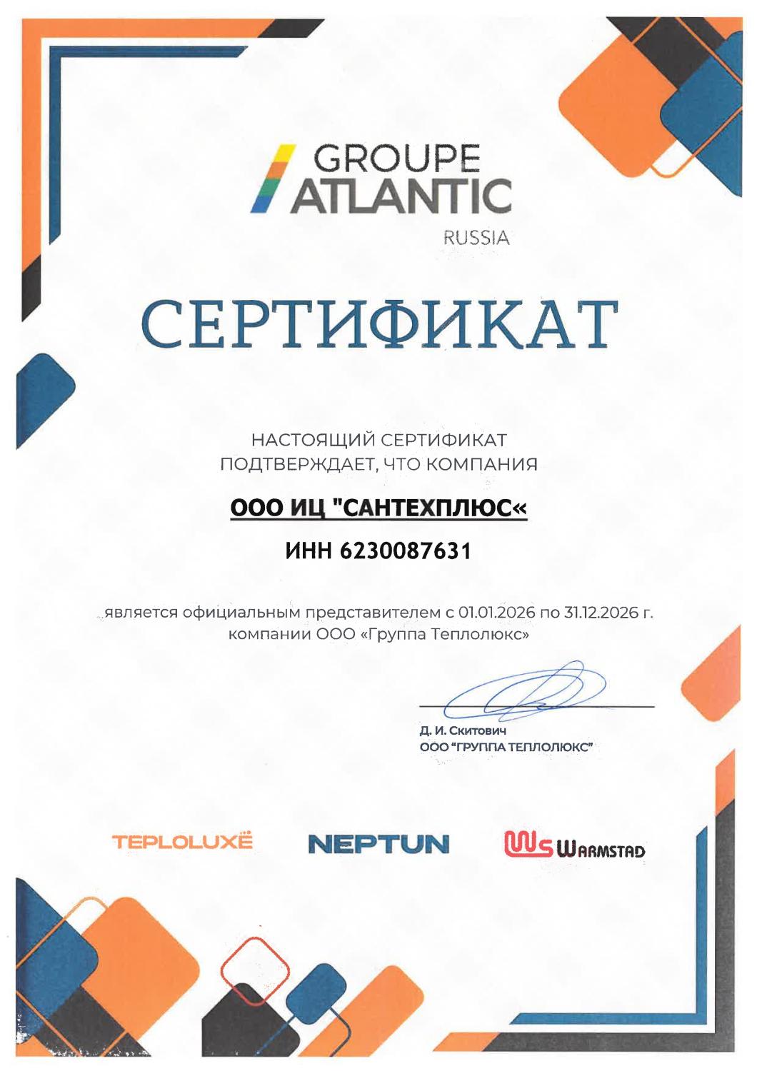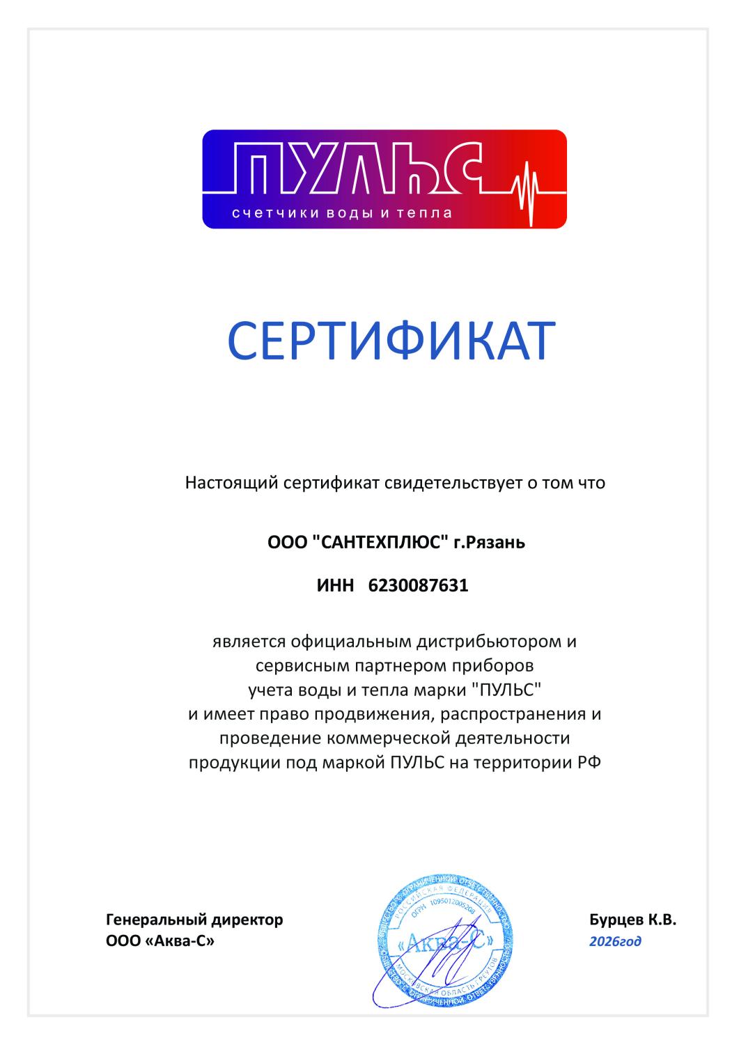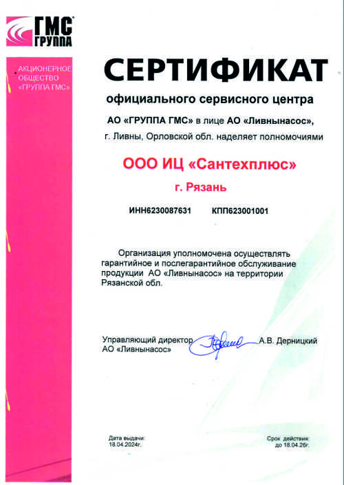 Сертификаты СЦ "Сантехплюс"