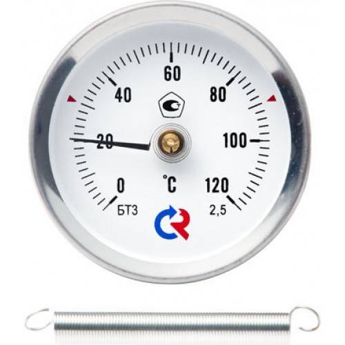 Тип БТ, серия 010. Термометр биметаллический накладной с пружиной предназначен для измерения температуры приповерхностного слоя среды (вязкой, жидкой, газообразной) цилиндрических объектов, например трубы в системе отопления.