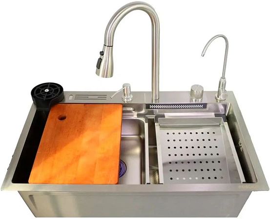 Комплектация: раковина, смеситель из стали, стальной кран для фильтра, пласт. кран для ополаскивания стаканов - 1 шт., подставка для посуды - 1 шт., подставка для мокрой посуды, подставка для ножей - 1шт, деревянная разделочная доска - 1 шт., пластиковый дозатор для мыла - 1 шт., пластиковый сифон - 1 шт., поставляется в комплекте с гибкой подводкой