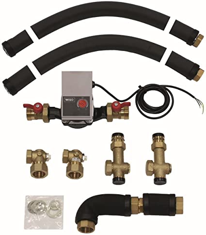 Присоединительный комплект водонагревателя Vaillant для котлов atmoVIT Состоит из двух гибких кислородоупорных труб по 1,5 м из нержавеющей стали в теплоизоляции, насоса, сервисных кранов насоса, обратного клапана и фитингов.